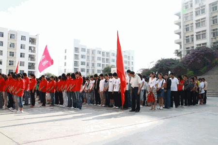 在新篮球场上,政教系师生身着红色T恤组成了“玉树”二字。同学们首先参观了玉树地震灾情文字和图片介绍,接着向玉树遇难同胞默哀三分钟,寄托哀思;在郭镛教授的带领下,政教系师生和各系学生代表慷慨解囊,向玉树灾情捐款,献上自己的一份爱心。