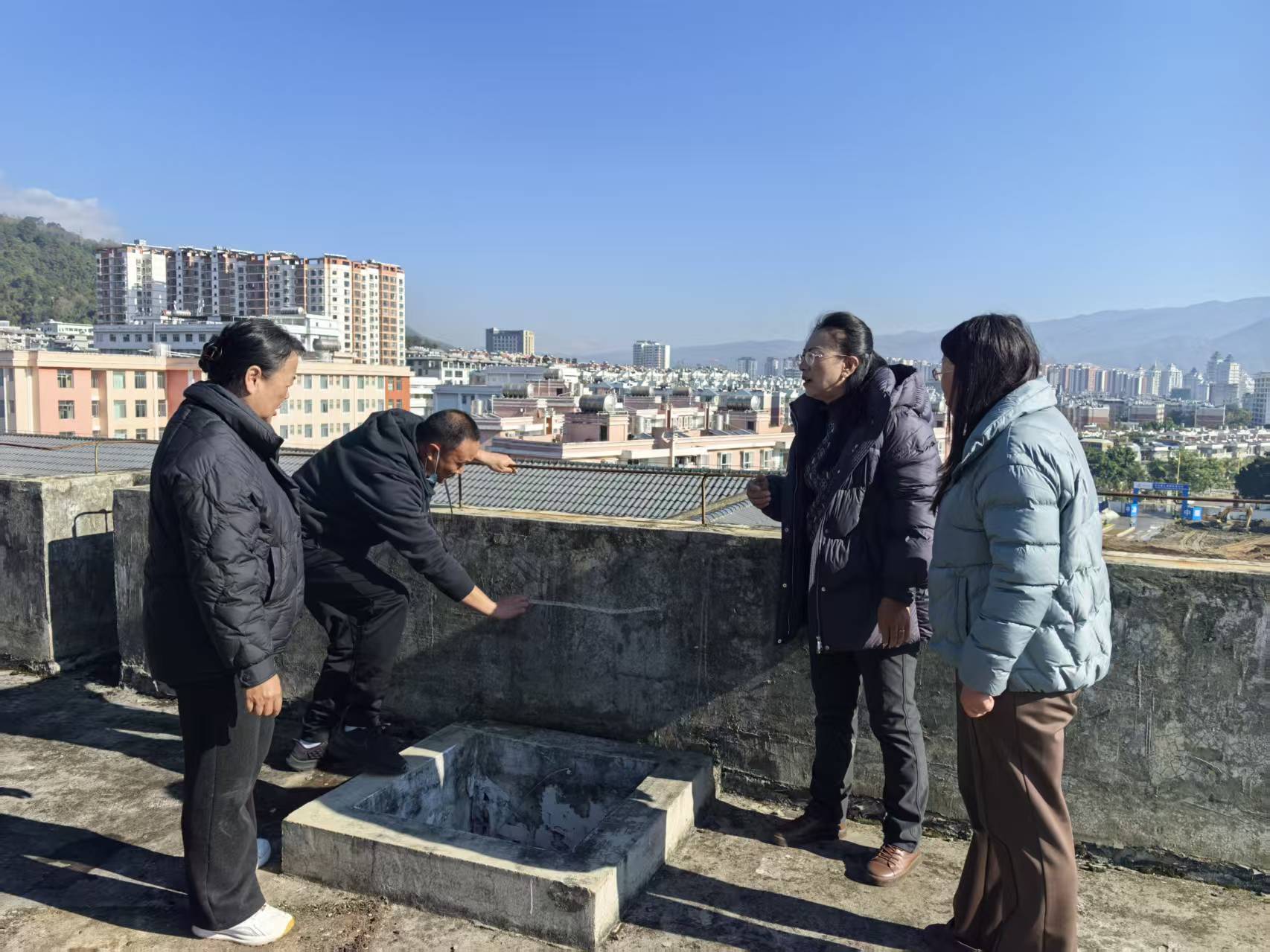 检查组严格遵循“不放过一处隐患、不漏过一个细节”的工作原则,对图书馆各楼层阅览区、卫生设施、四楼平台及公共空间进行全面细致排查。重点围绕建筑结构安全性能、设施设备运行状态、消防系统保障能力等方面展开检查。经检查发现,图书馆存在以下安全隐患:卫生设施普遍存在管道渗漏及地面积水问题;四楼平台排水系统效能不畅,雨季积水问题严重并导致建筑渗透;多处公共区域墙面出现空鼓、开裂及饰面脱落等结构性缺陷,存在高空坠物风险。刘艳红详细询问情况、分析成因,并要求责任部门立即记录、限期溯源、彻底整改。