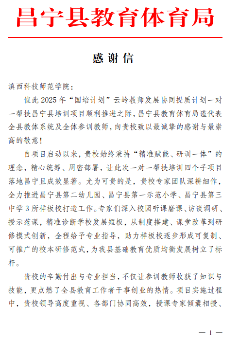 近日,保山市昌宁县教育体育局向学校发来感谢信,对学校在2025年“国培计划”云岭教师发展协同提质计划一对一对口帮扶昌宁县培训项目中的倾力帮扶致以诚挚感谢与崇高敬意。